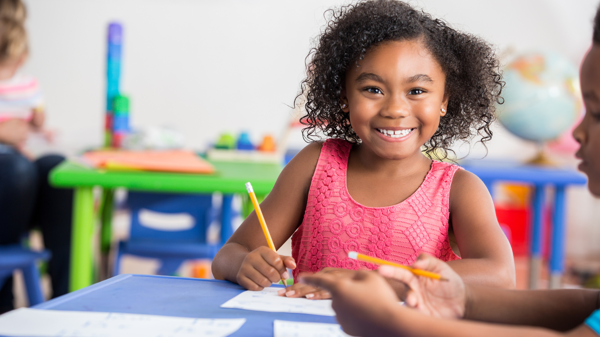 Smiling young girl drawing with colored markers at a table in a colorful classroom with a world map background.